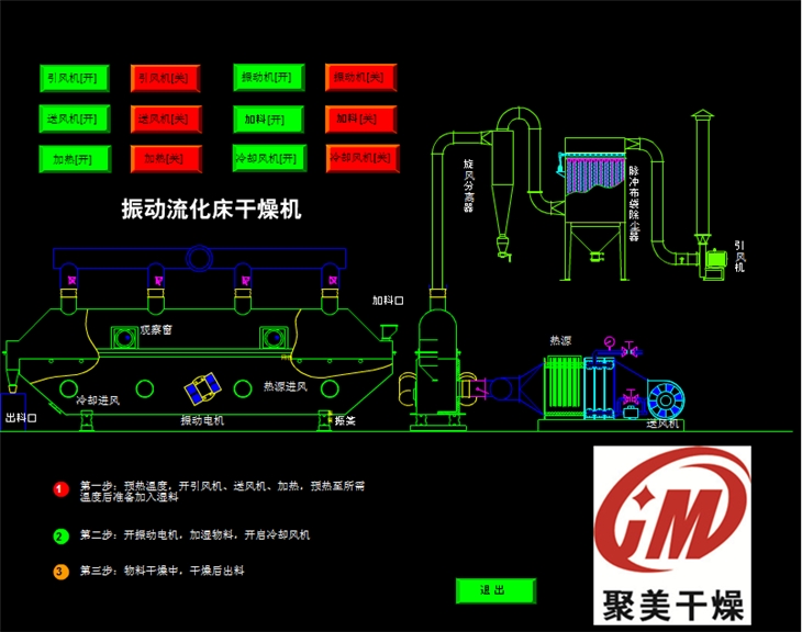 ZLG振动流化床干燥机广泛使用于化工、轻工、医药、食品、塑料、粮油、矿渣、制盐、糖等行业的粉料的干燥、泠却、增湿等作业。物料自进料进口进入机内,在振动力作用下,物料沿水平面流化床抛掷,向前连续运动,热风向上穿过流化床同湿物料换热后,湿空气经旋风分离器除尘后由排风1:3排出,干燥物料由排料进口排出。
