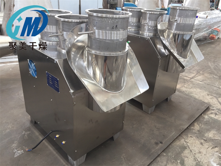 粉末的流动差异容易导致裂纹,且片重差异很大。因此,在压片之前,最好先做成颗粒。中西药制粒一般都是用这种机器制作的,因为这种机器生产的颗粒流动性好,压制的片重均匀,色泽鲜艳。本机可将湿粉末制成颗粒,也可用于某些条状和不规则易碎、易松散、较脆性材料的破碎和分散,作为磨粉的前道工序。一机具有制粒、破碎、布料三种功能,可达到一机多用的目的。