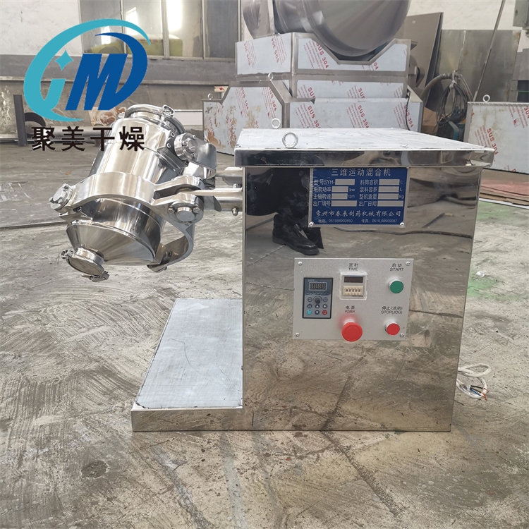 三维运动混合机俗称"多向运动混合机"是一种广泛应用于制药、化工、食品、轻工等行业及科研单位的新颖物料混合机。该机能非常均匀地混合流动性较好的粉状或颗粒状的物料。该机在工作时,由于混合桶具有多方向运转动作,使各种物料在混合过程中,加速了流动和扩散,同时避免了一般混合机因离心力作用所产生的物料比重偏析和积聚现象,因此可取得极好的混合效果。