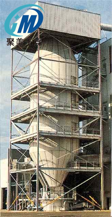 本机组工作过程为料液通过隔膜泵高压输入,喷出雾状液滴,然后同热空气并流下降,大部分粉粒由塔底排料口收集,废气及其微小粉末经旋风分离器分离,废气由抽风机排出,粉末由设在旋风分离器下端的授粉筒收集,风机出口还可装备二级除尘装置,回收率在96-98%以上。